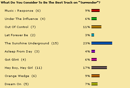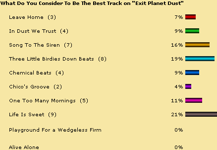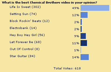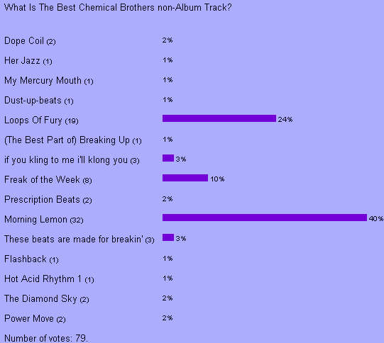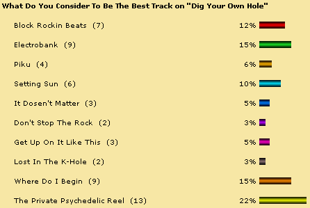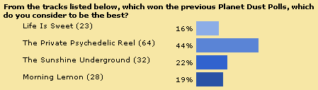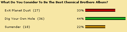 Quest To Find Best Chems Track Ever Is Complete! So what's the best Chemical Brothers track of all time? What a terrible question. It would be very difficult to pick one track above all others. However, over the last few months Planet Dust has been trying to establish just that. We began in September 2001, trying to find out what is the fans favourite track from "Exit Planet Dust". "Life Is Sweet" was the narrow winner. The October poll asked what was the fans favourite track from "Dig Your Own Hole". "The Private Psychedelic Reel" topped the poll with 22% of the vote. The November poll asked fans to vote for the best track on "Surrender". "The Sunshine Underground" topped the poll with 23% of the vote. Finally in December, the poll looked at fans favourite non-album tracks (excluding remixes). "Morning Lemon" topped that poll, with 40% of the vote. Then, over the course of January and February we put those four winners up against each other, to see which of the four tracks Planet Dust visitors would vote as the best Chemical Brothers track of all time. The winner was "The Private Psychedelic Reel", which received 44% of the vote. See full breakdown of results in the charts below.